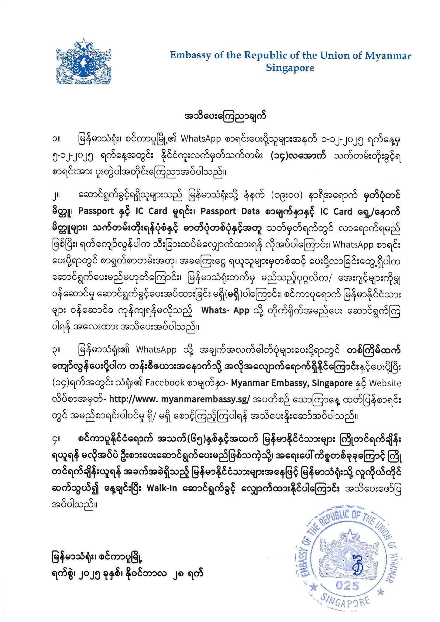 For tax payment only, it is require to bring tax form, passport copy, Sg IC copy, Myanmar IC copy Each & payable Cash.