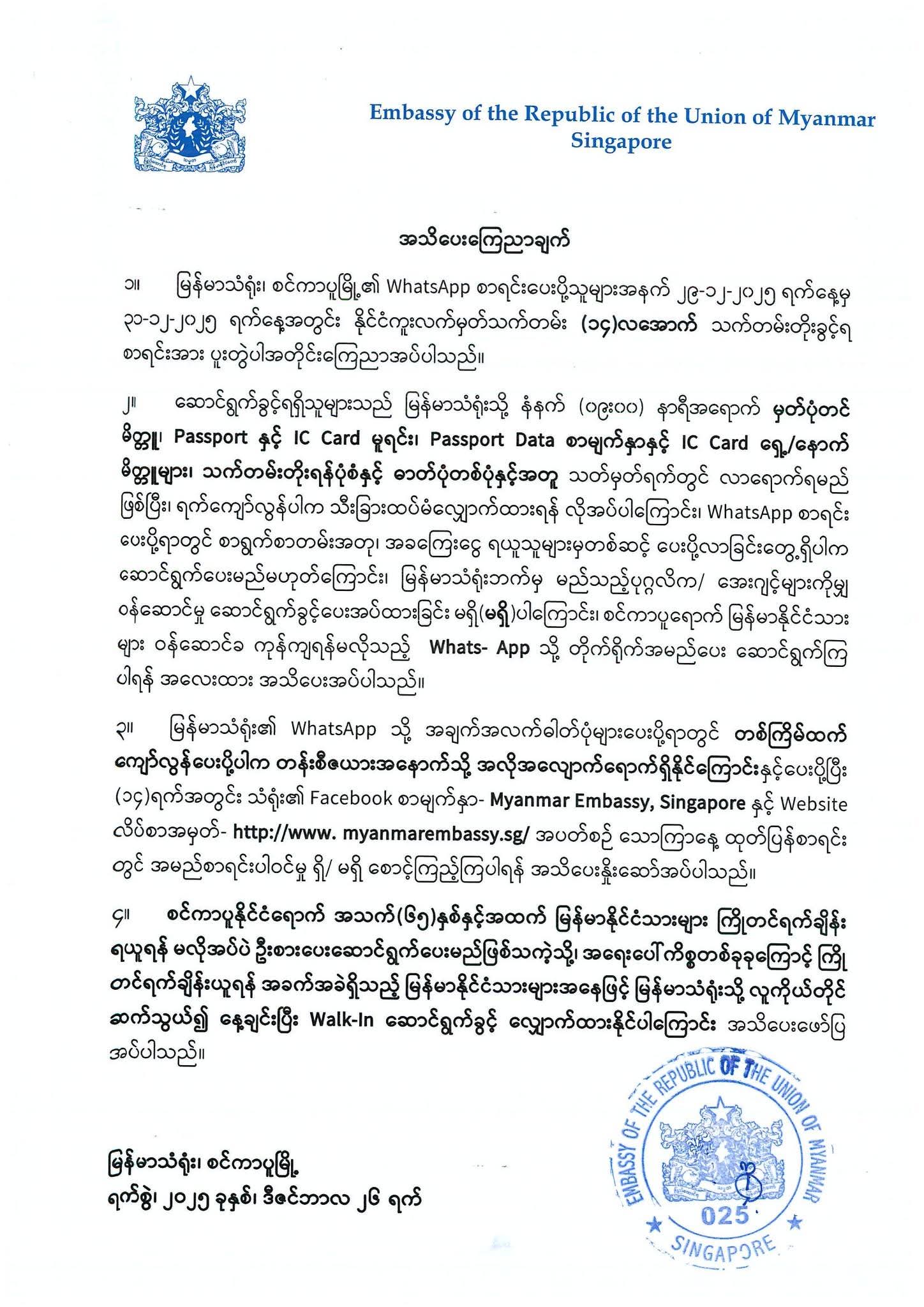 For tax payment only, it is require to bring tax form, passport copy, Sg IC copy, Myanmar IC copy Each & payable Cash.