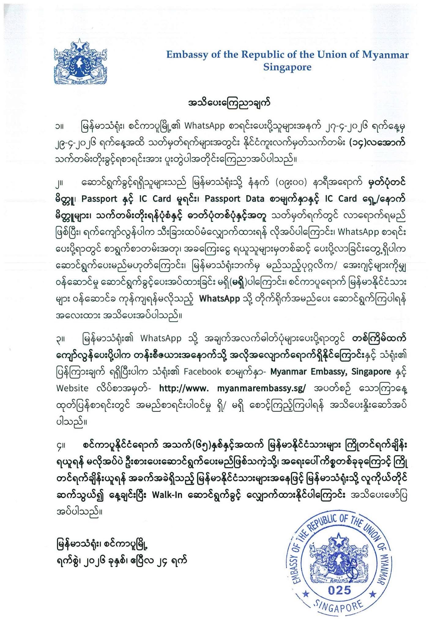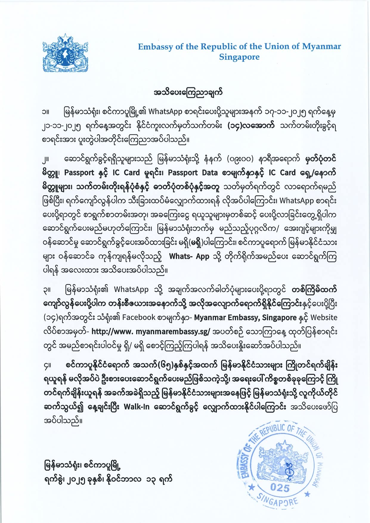 For tax payment only, it is require to bring tax form, passport copy, Sg IC copy, Myanmar IC copy Each & payable Cash.
