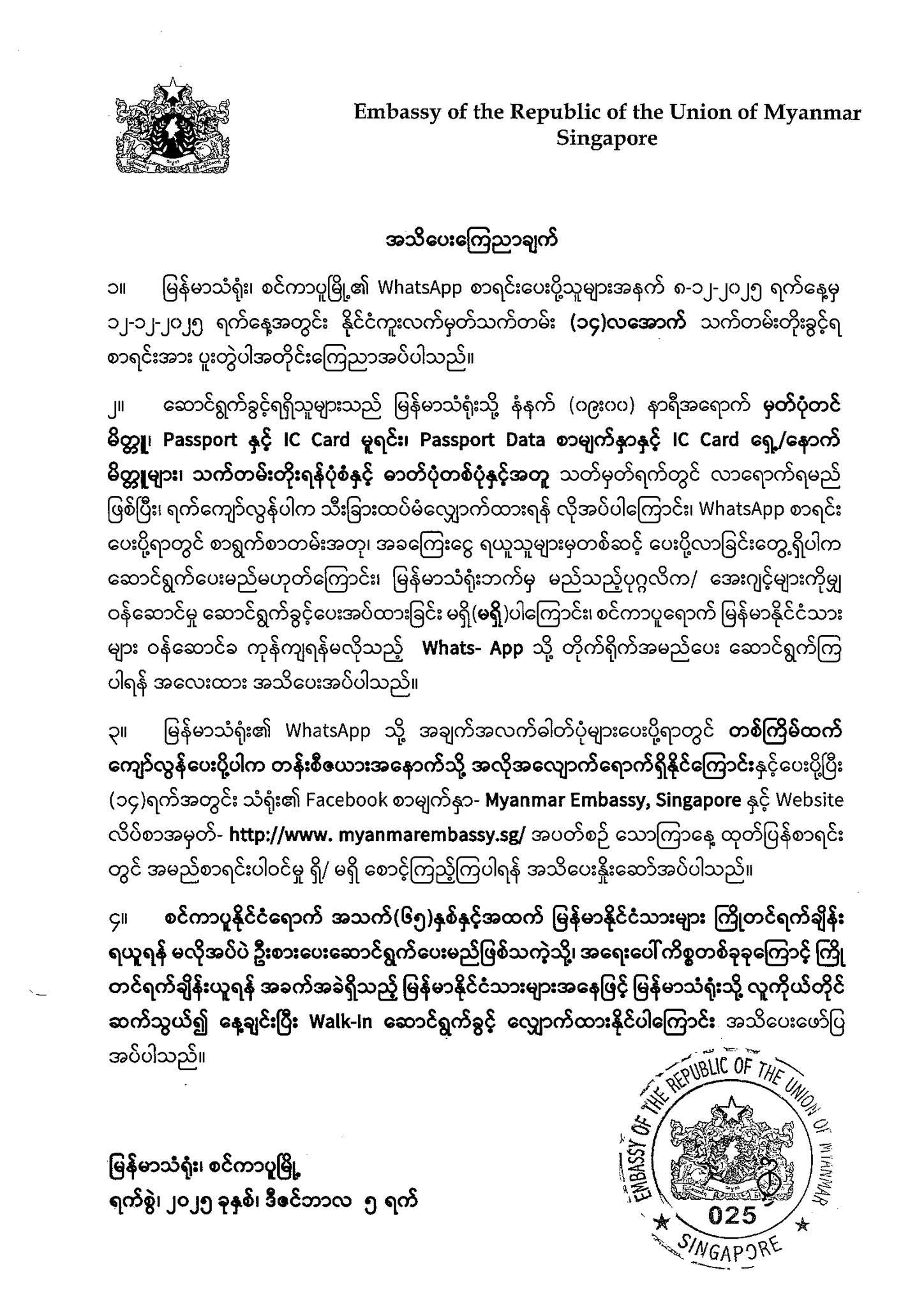 For tax payment only, it is require to bring tax form, passport copy, Sg IC copy, Myanmar IC copy Each & payable Cash.